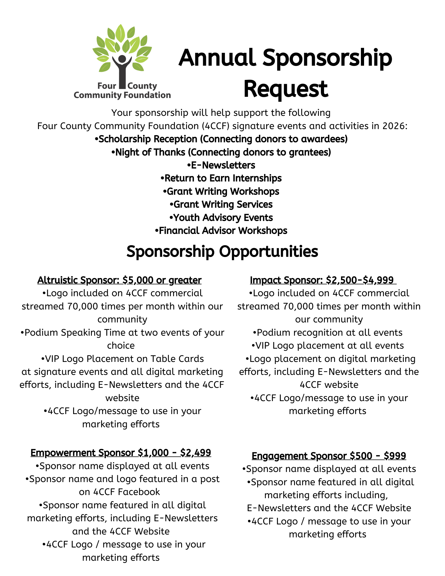 Businesses, families and individuals can support the work of Four County Community Foundation by becoming a 2026 Annual Sponsor!